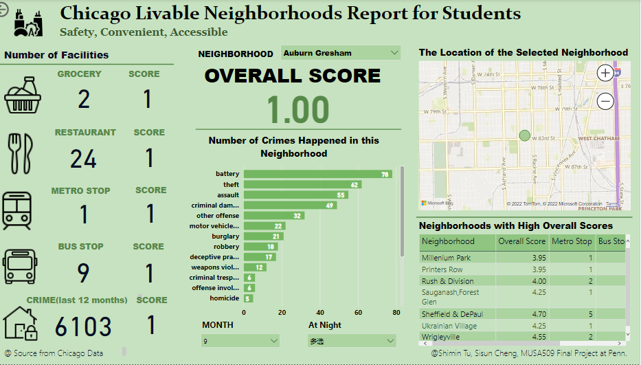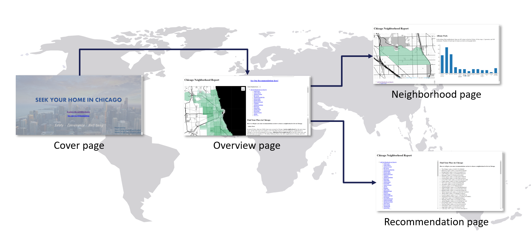A series of web-based maps show the evaluation of the safety and convenience of each neighborhood in Chicago based on crime data and local amenities. Residents especially students could choose a reasonable and livable neghborhood to move in, and find local amenities easily!
